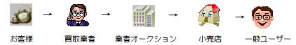 お客様から¥2.000で買い取る→業者間オークションで小売店に¥5.000で売る(手数料1割ほど掛かる)→小売業者が¥10.000で一般ユーザーに販売します。