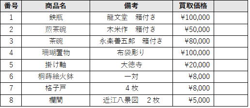 骨董品全般 茶道具 煎茶道具 仏像 鉄瓶 香木 掛け軸 古書 絵画 武具 珊瑚 象牙商品 銀製品 古民具 植木鉢 古銭 切手 古い建具 燈篭(人力で運べるもの) 古いおもちゃ 楽器全般 着物 帯留め 浮世絵 刀 唐木家具